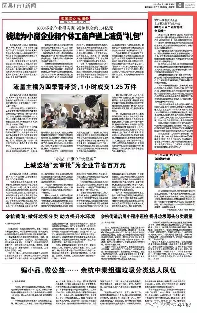 4月22日,杭州日?qǐng)?bào)以“富陽(yáng)一高新技術(shù)企業(yè) 自主研發(fā)數(shù)字化生產(chǎn)線(xiàn)”為題,報(bào)道我公司智能化、數(shù)字化、高端化的連續(xù)纏繞玻璃鋼夾砂管(簡(jiǎn)稱(chēng)CWFP)3D打印技術(shù)生產(chǎn)線(xiàn)。