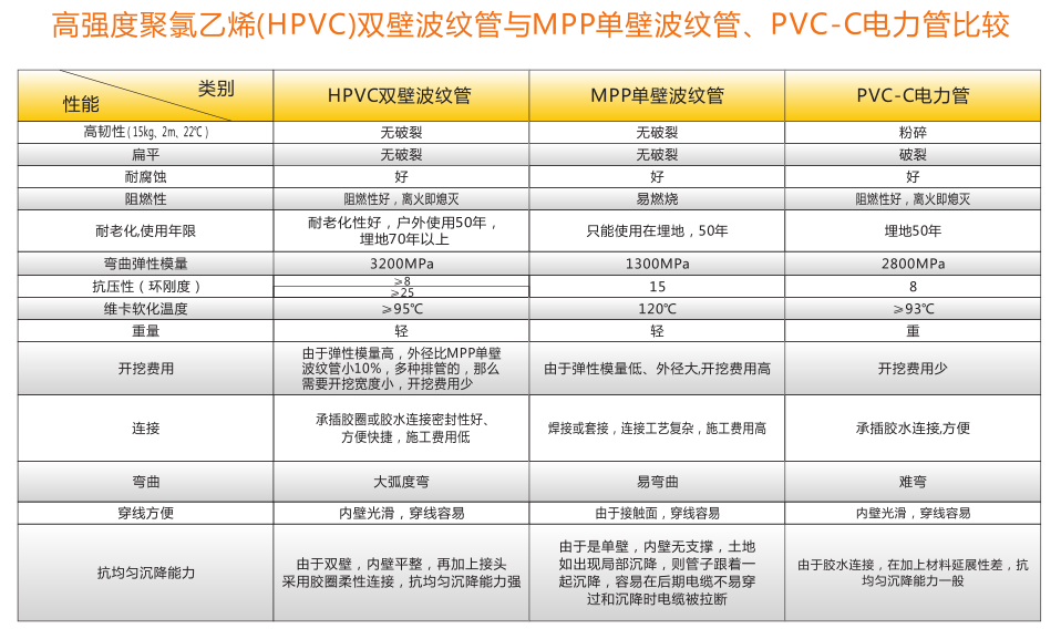 高強度聚氯乙烯(HPVC)雙壁波紋管內、外壁之間呈中空環狀結構,充分利用工字鋼結構原理,提高截面 慣性矩,環鋼度高。產品具有強度高、韌性好、質地輕等優點。產品運用開挖工程,可代替MPP單壁波紋管、玻璃鋼管、PVC-C電力管、PVC-U通信管等管材。