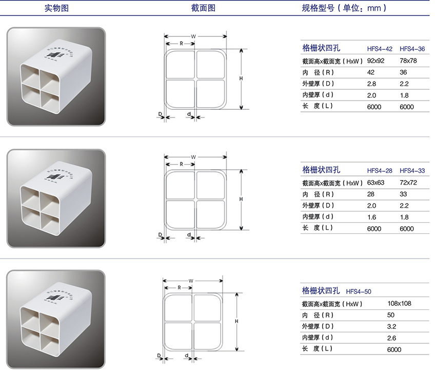“豐”牌PVC四孔柵格管適用于通信光纜的穿導、隔離及保護,廣泛應用于光纖通訊、有線電視、多媒體傳輸等工程。